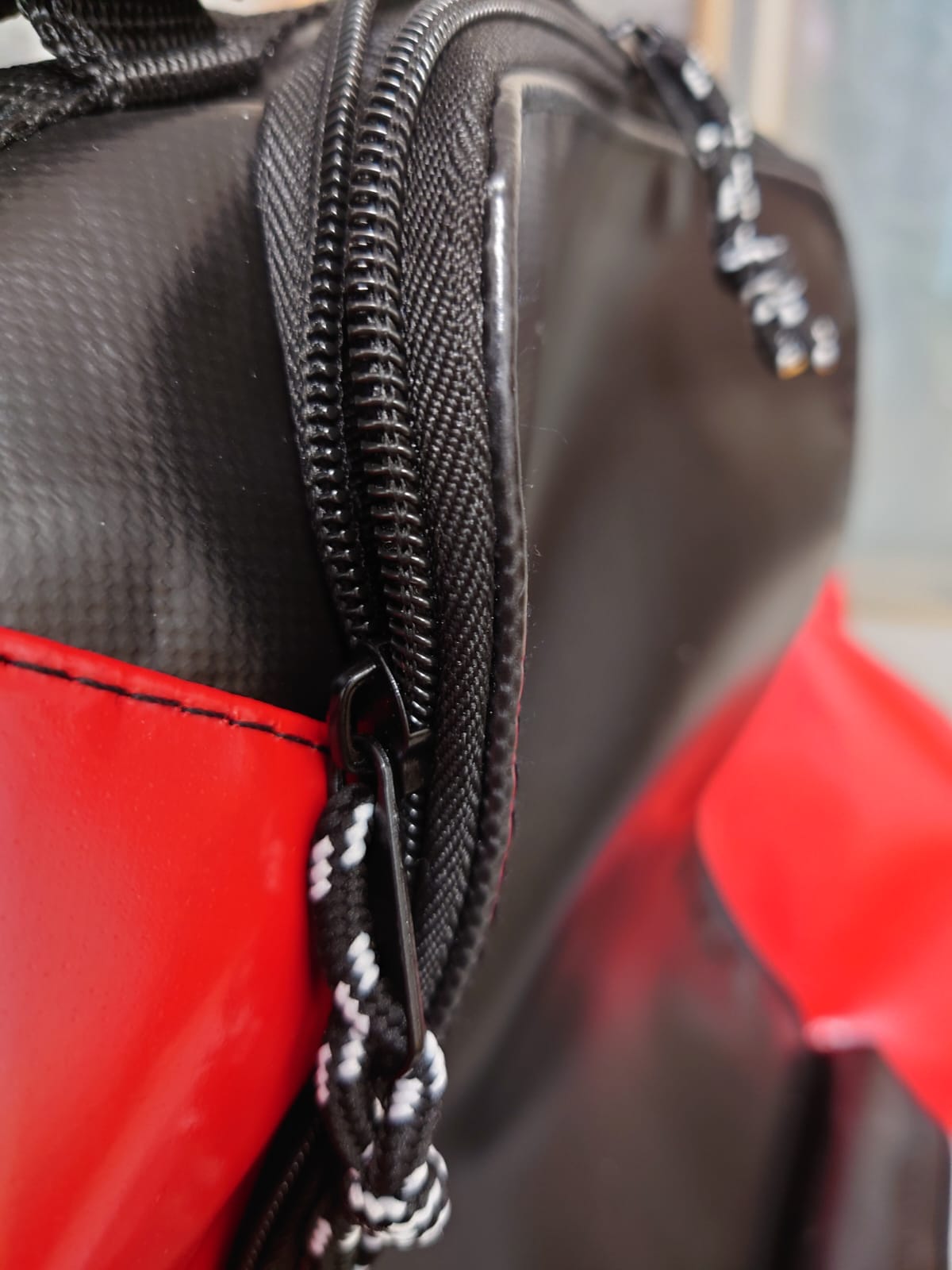 Сумка за сидением, основное отделение и карман спереди: 42(26)-29(18,8)-54(55) см, материал тент черный и красный, подклад оксфорд черный, усиление спинки и дна пластик, стропы 3 и 4 см, светоотражающие ленты, трехщелевые регуляторы, фасты, молния 8 мм, три собачки (две на крышке, одна на кармане).